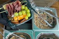 mobile charcuterie cart with cup or tra options of meats, cheese, fruits and crackers